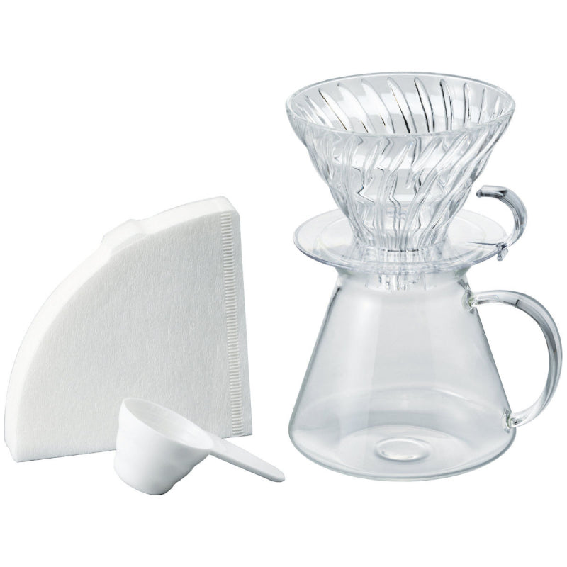 An all in one V60 drip brewing set which allows the user to achieve maximum, controlled extraction from freshly roasted beans, with a V60 shaped cone design for maximum air flow. The perfect kit for getting started with V60. The perfect gift for a home brew enthusiast Product features • Brand: Hario • Range: V60 • Dripper material: glass • Server material: borosilicate glass • Scoop material: plastic • Filters: V60 paper filters, size 02 (x40 included) • Filter lifespan: single use • Size: 02 • Brews: 1-4 cups • Kit includes: dripper, server, filter papers (x40), scoop • Rinse clean
