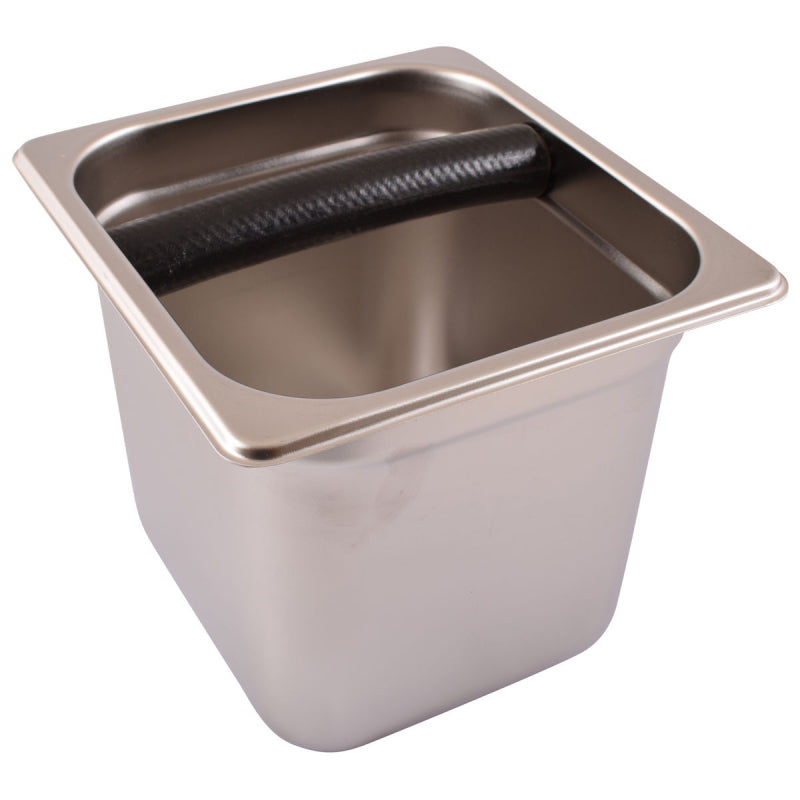 Knock box for setting into the counter top, or freestanding if used with a stainless steel or wood surround, sold separately. This knock box features a stainless steel finish and is supplied with a rubberised bar to ensure quiet operation Product features • Material: stainless steel • Dimensions: H: 135 x W: 160 x D: 175mm • Weight: 500g • Includes rubberised bar for quiet operation • Also available: replacement rubber sleeve for knock bar